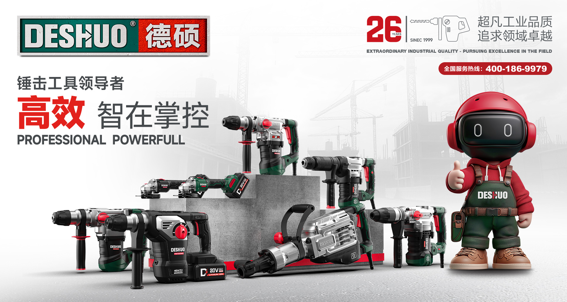 浙江德硕科技股份有限公司成立于1999年,位于世界五金之都的永康市,是一家集电锤电镐、锂电系列电动工具产品的研发、生产和销售为一体的国家高新技术企业。